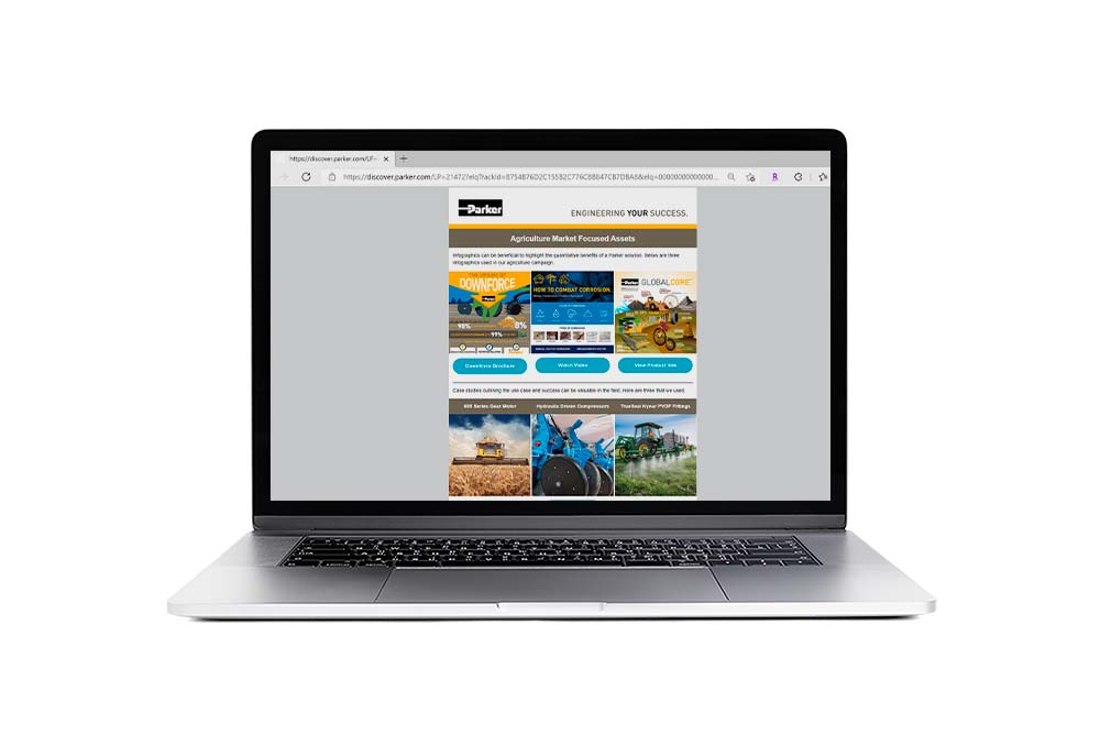 An agriculture email marketing campaign was promoted Parker components and solutions for agriculture. Content is sorted by type for your use.