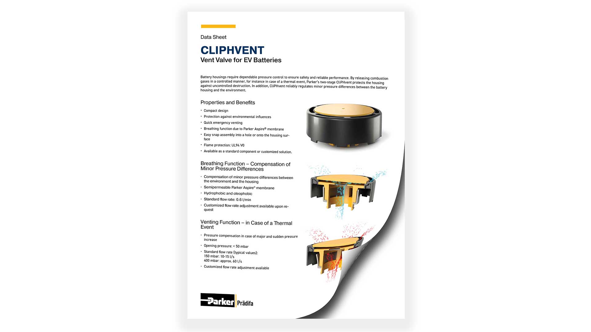 Battery housings require dependable pressure control to ensure safety and reliable performance. By releasing combustion gases in a controlled manner, for instance in case of a thermal event, Parker’s two-stage CliPHvent protects the housing against uncontrolled destruction. In addition, CliPHvent reliably regulates minor pressure differences between the battery housing and the environment.